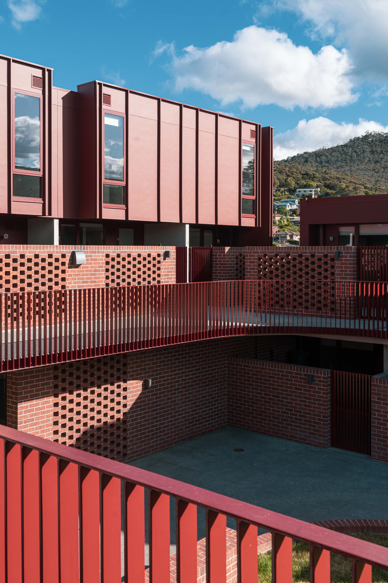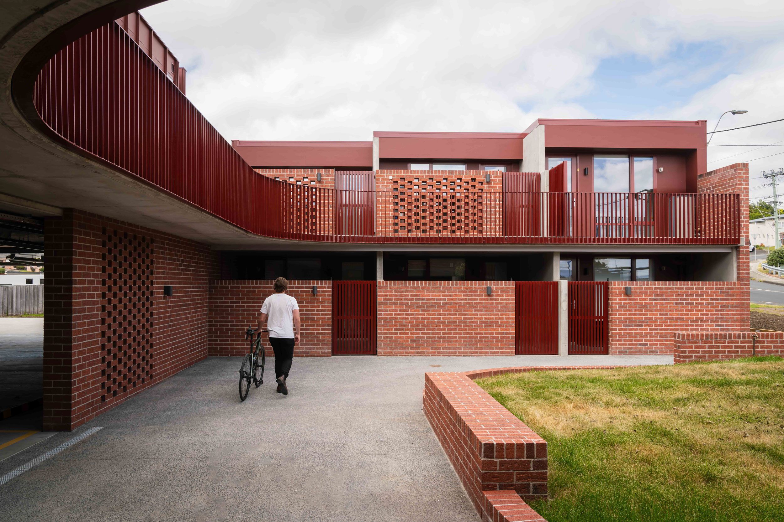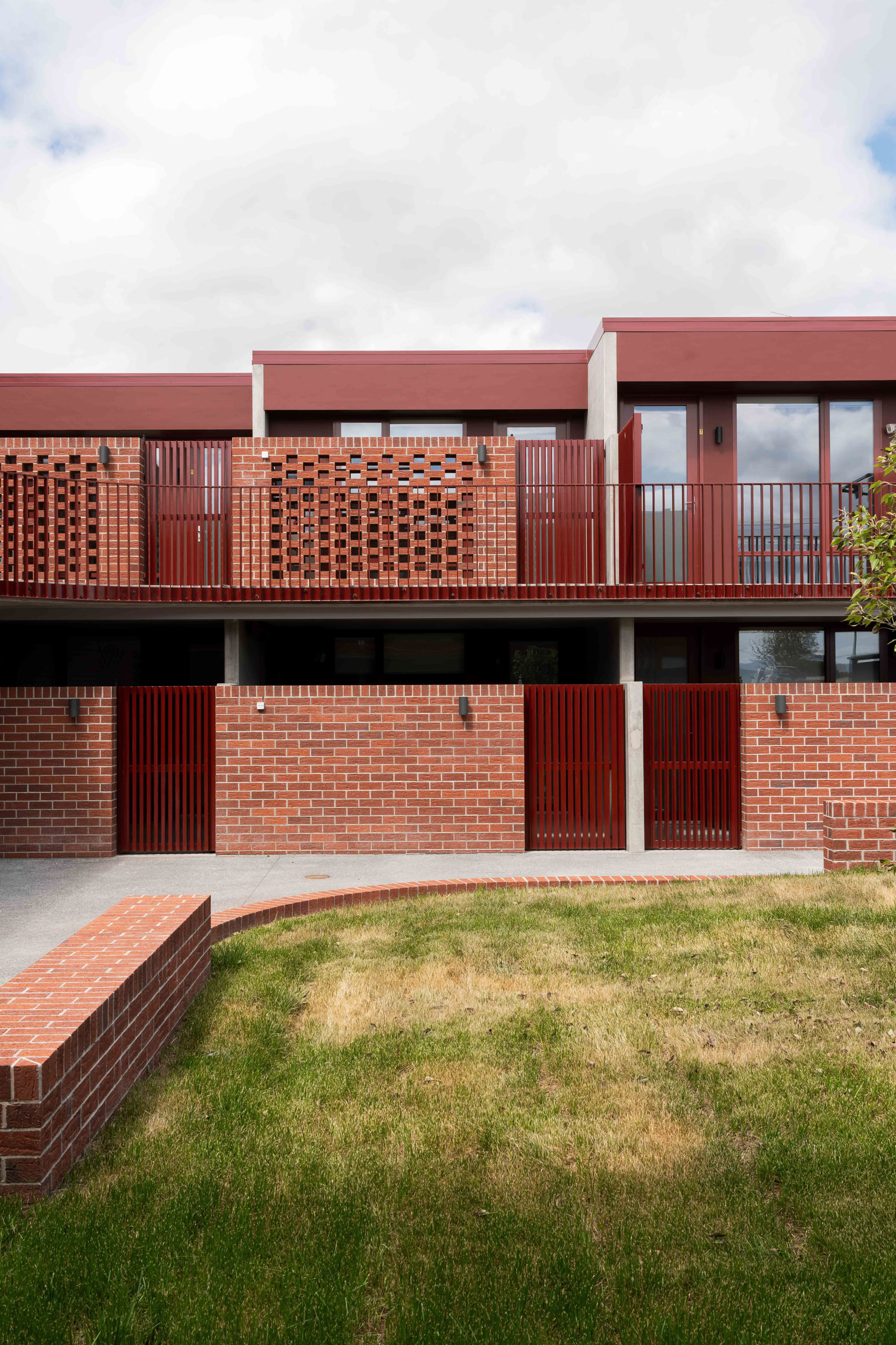The design comprises twelve one-bedroom units over two levels, and six two-bedroom units located over a concealed carpark. The units are broken into three forms which are connected by a simple circulation spine which connects the site in an East West direction as the units radiate around a central outdoor area.