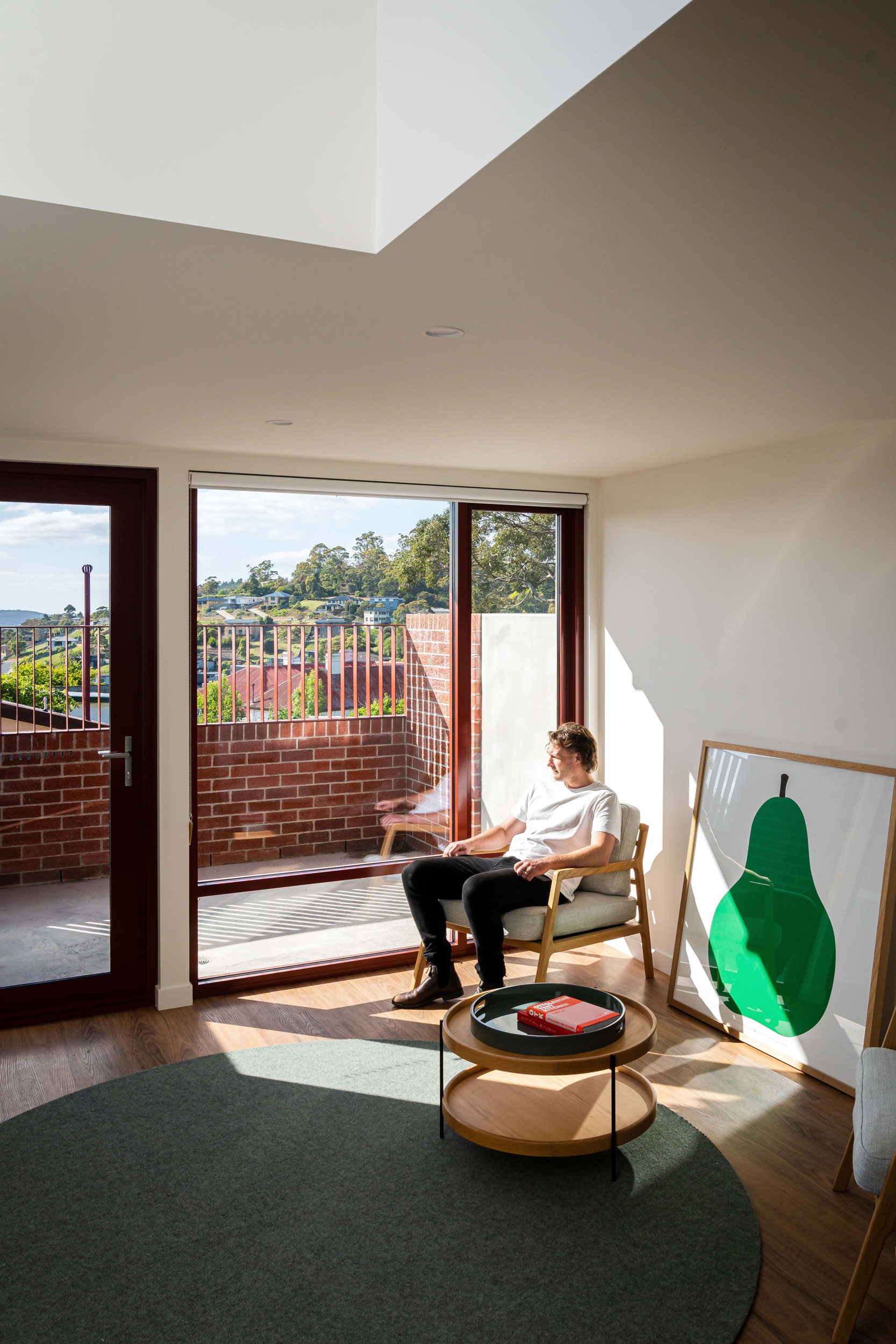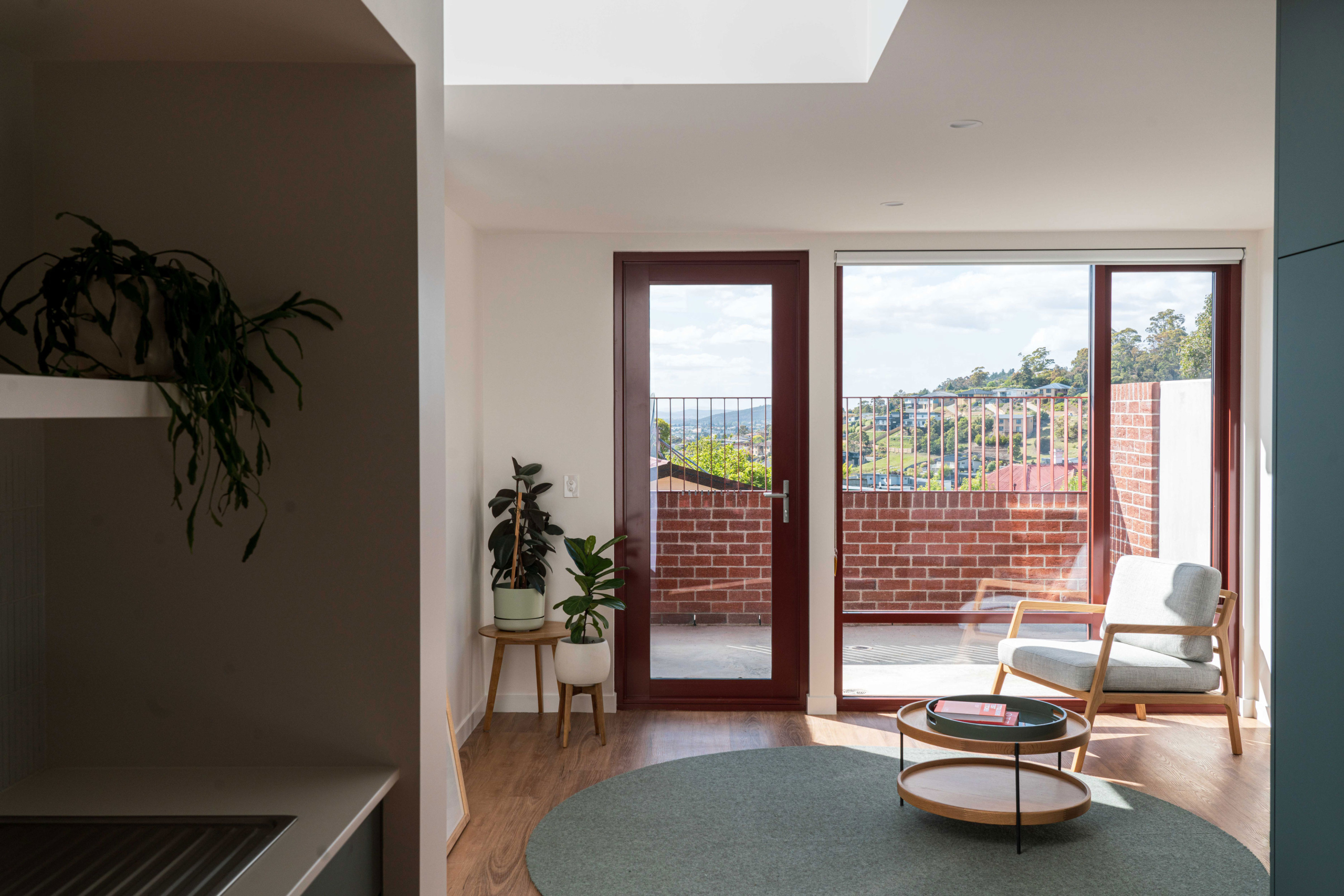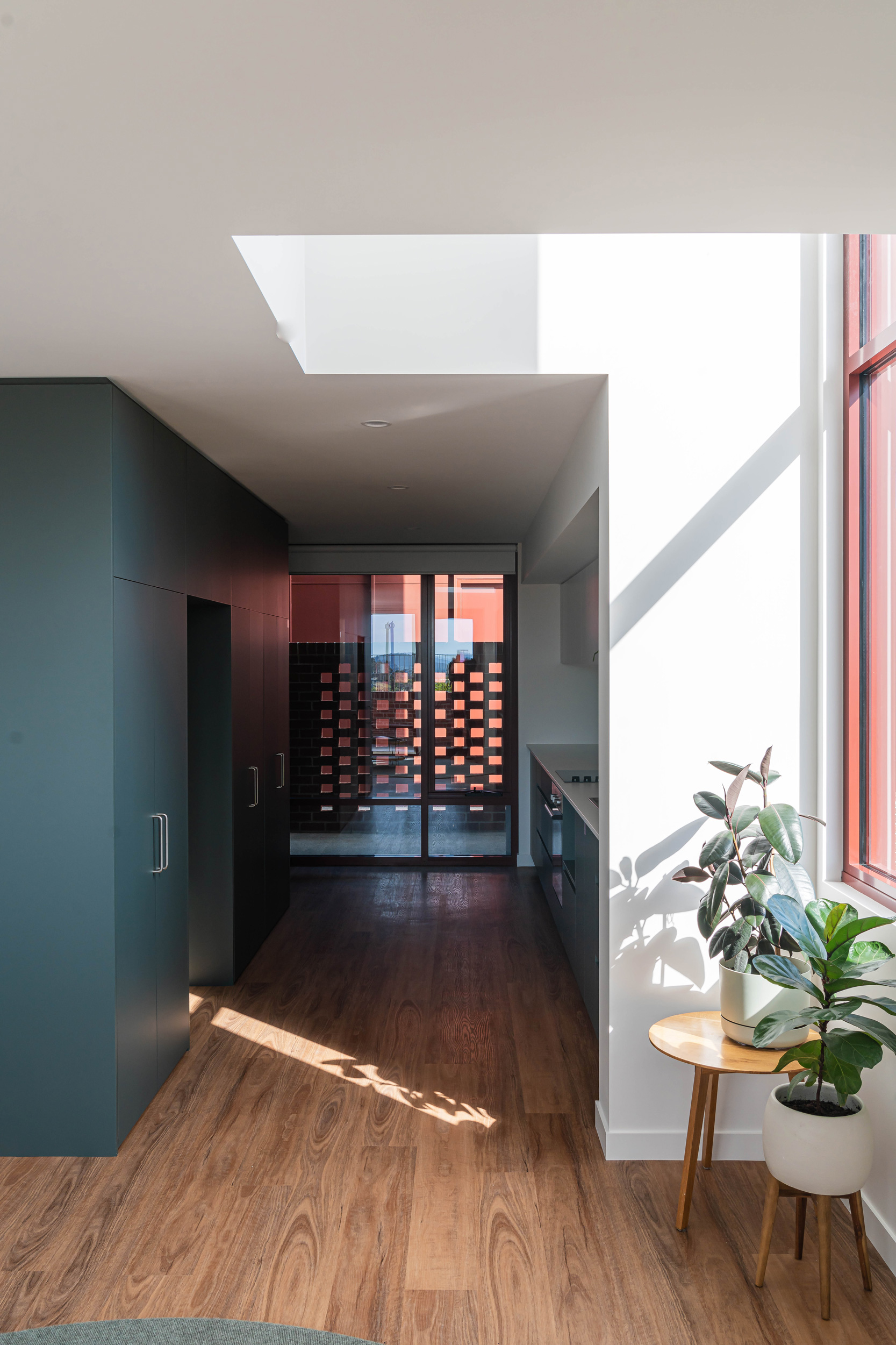 The design comprises twelve one-bedroom units over two levels, and six two-bedroom units located over a concealed carpark. The units are broken into three forms which are connected by a simple circulation spine which connects the site in an East West direction as the units radiate around a central outdoor area.